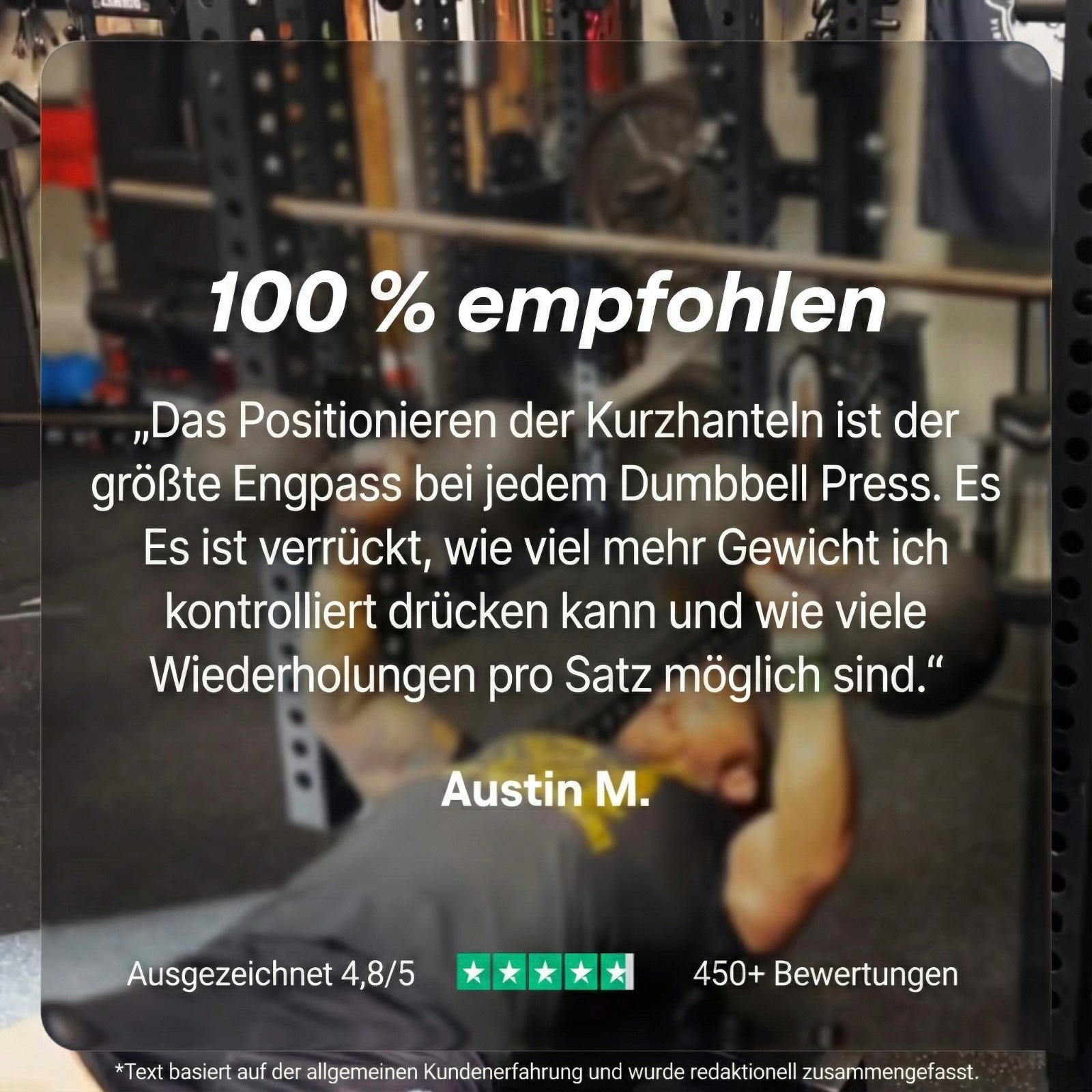 Die Anhebephase bei Kurzhantel-Bankdrücken oder Schulterdrücken bringt deine Schultern in eine riskante Position und kostet unnötig Energie – besonders bei hohen Gewichten. Mit den Kraftlock-Hooks ist das Umsetzen so sicher wie jede einzelne Wiederholung. Bleib in sauberer Form!